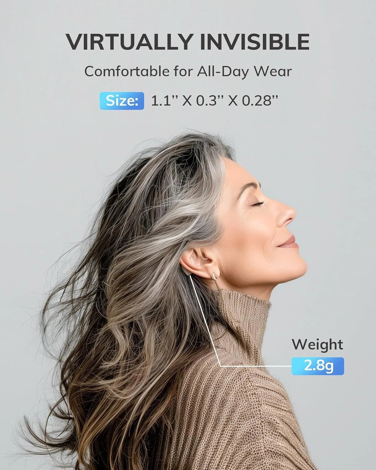 A pair of rechargeable digital invisible mini BTE hearing amplifiers engineered to discreetly boost sound and enhance voice clarity for everyday listening.