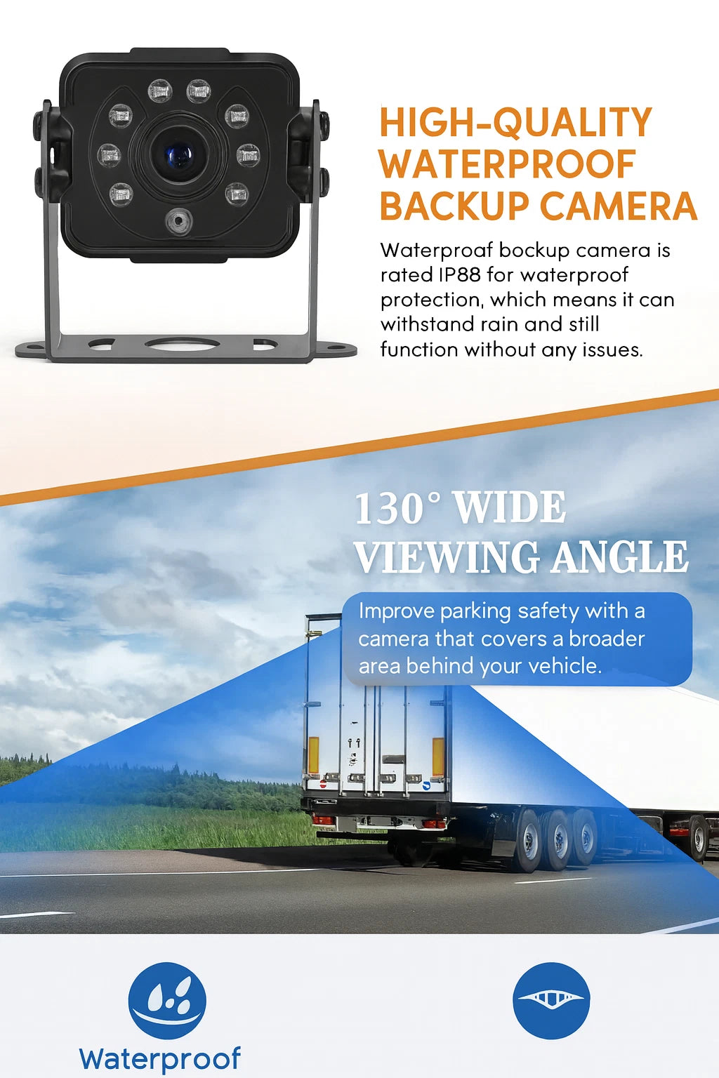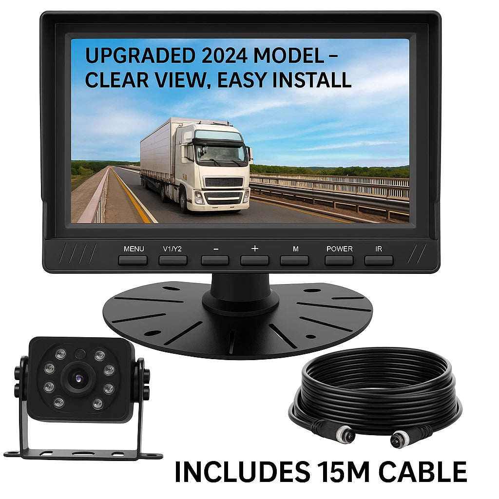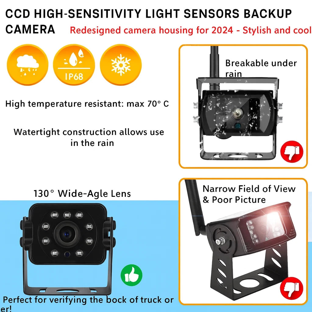 A universal wireless RV backup camera system featuring a 7″ 1080P HD monitor with night vision and a waterproof design for safer reversing and parking.